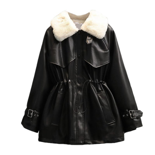 Plus Size Women's Winter Fashion Temperament Waist-controlled Fleece-lined Leather Coat