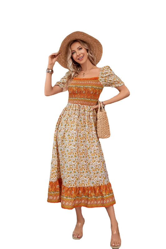 Bohemian Square Collar Puff Sleeve Printed Women's Dress