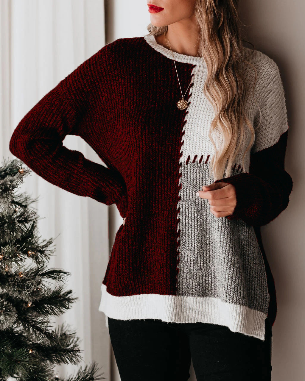 Suéter holgado de cuello redondo con contraste de color para mujer
