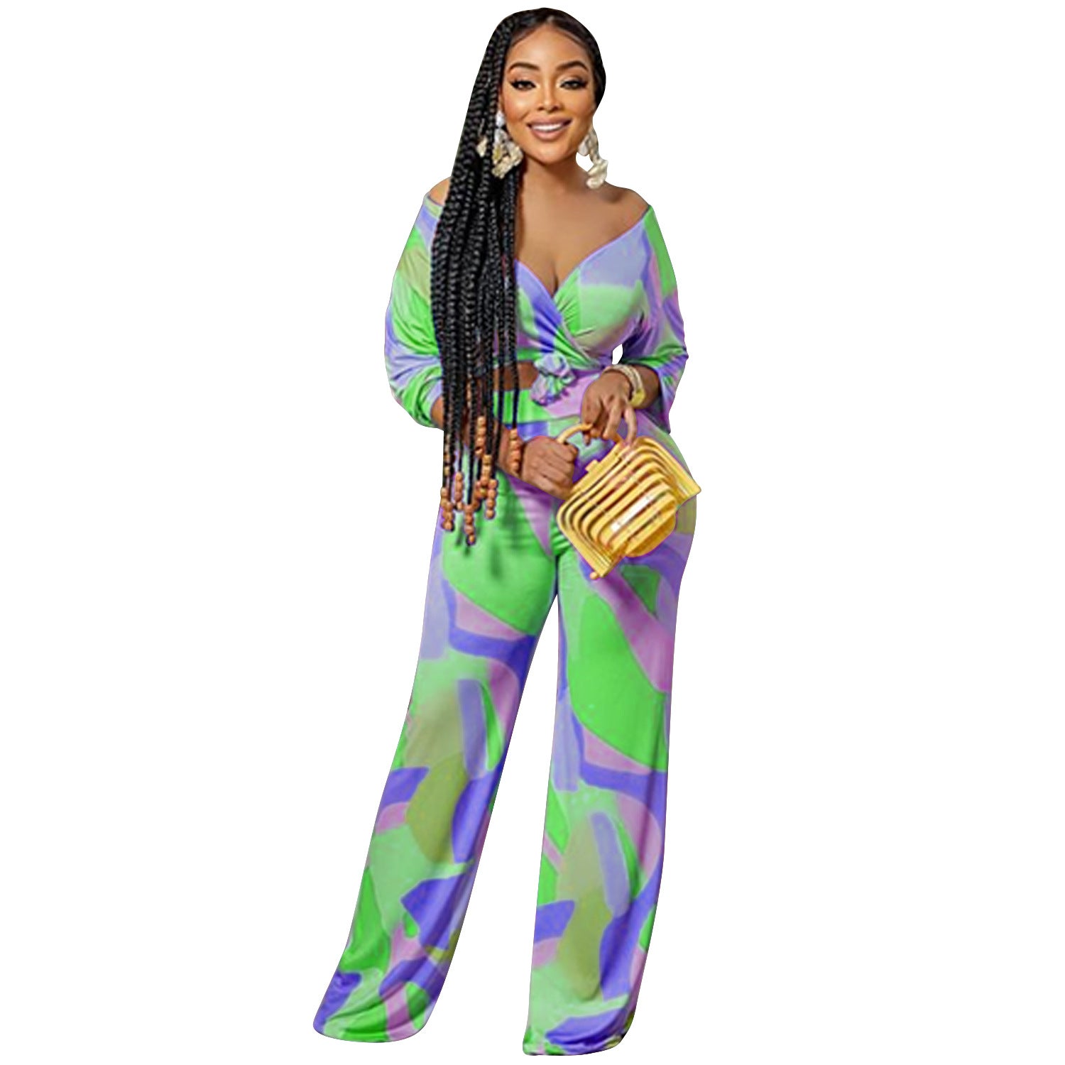 Traje de dos piezas con escote en V y pantalones de manga larga con estampado irregular para mujer