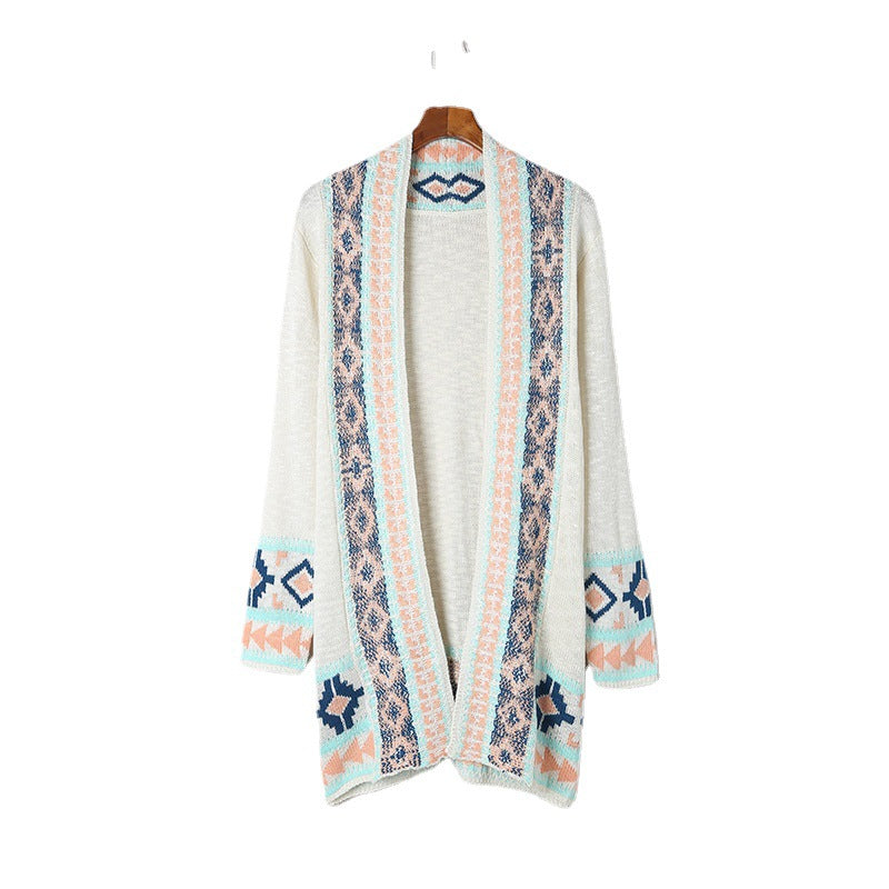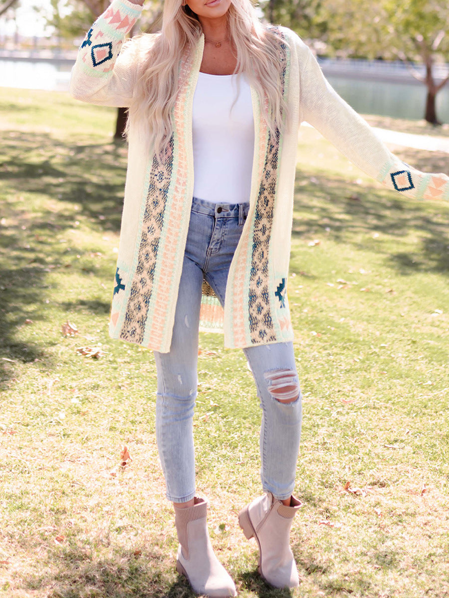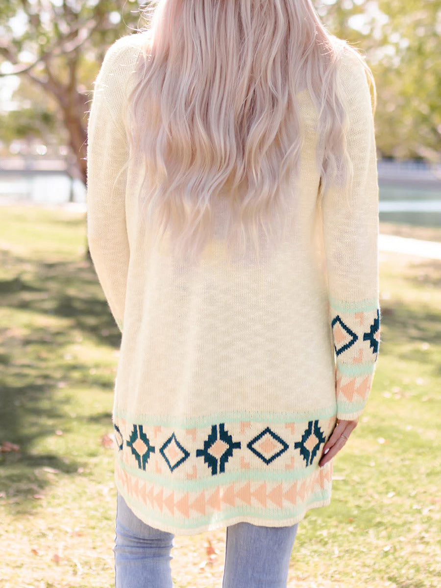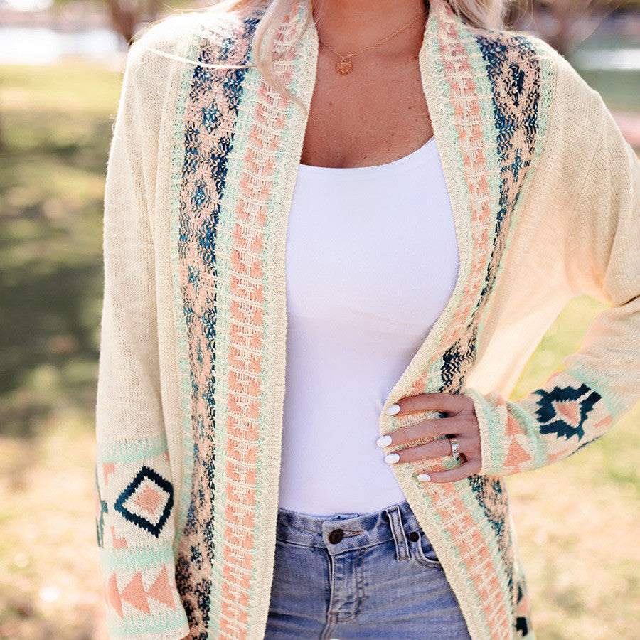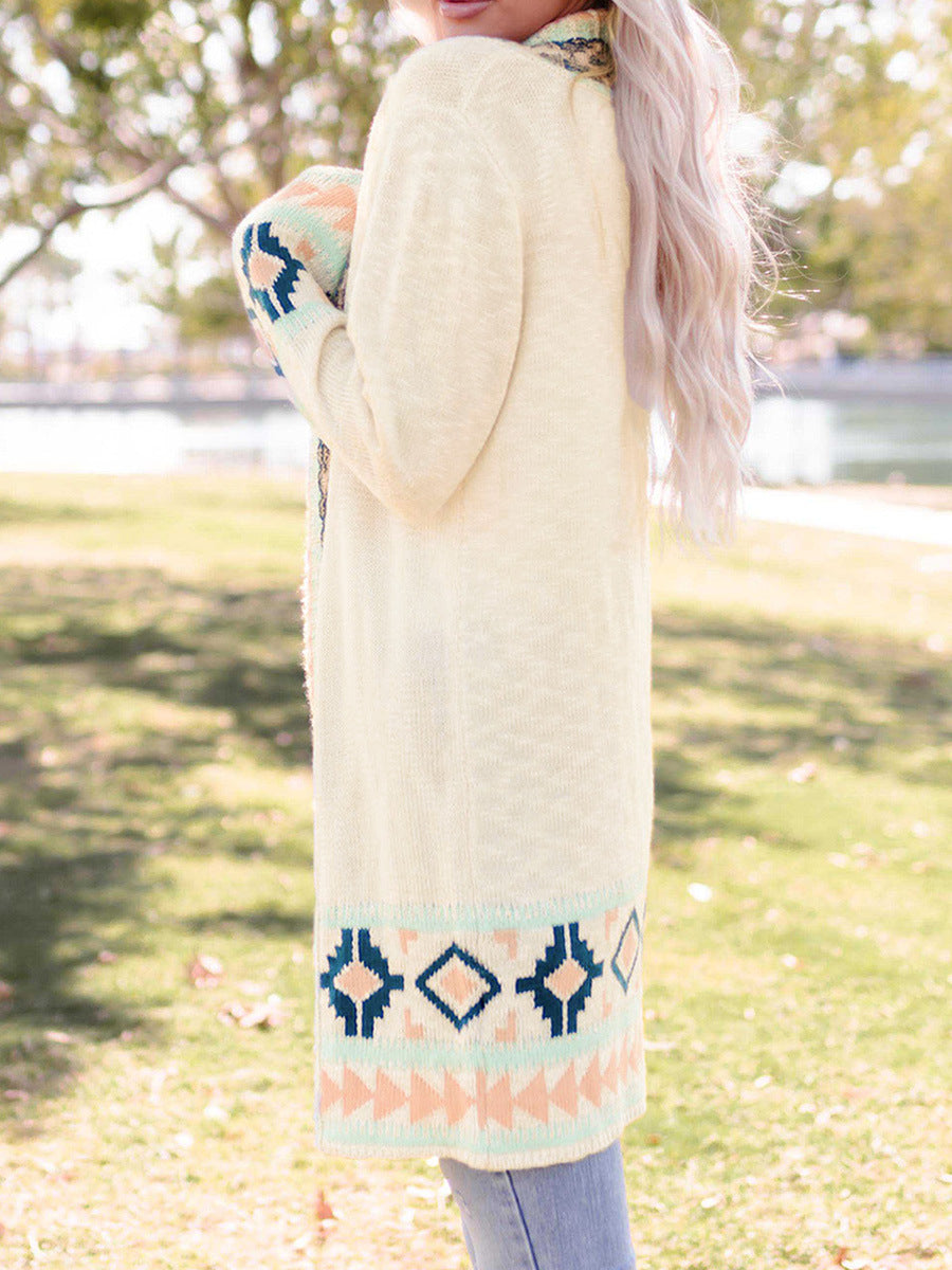 Beige Printing Cardigan Sweater Women's Loose Long Sleeve