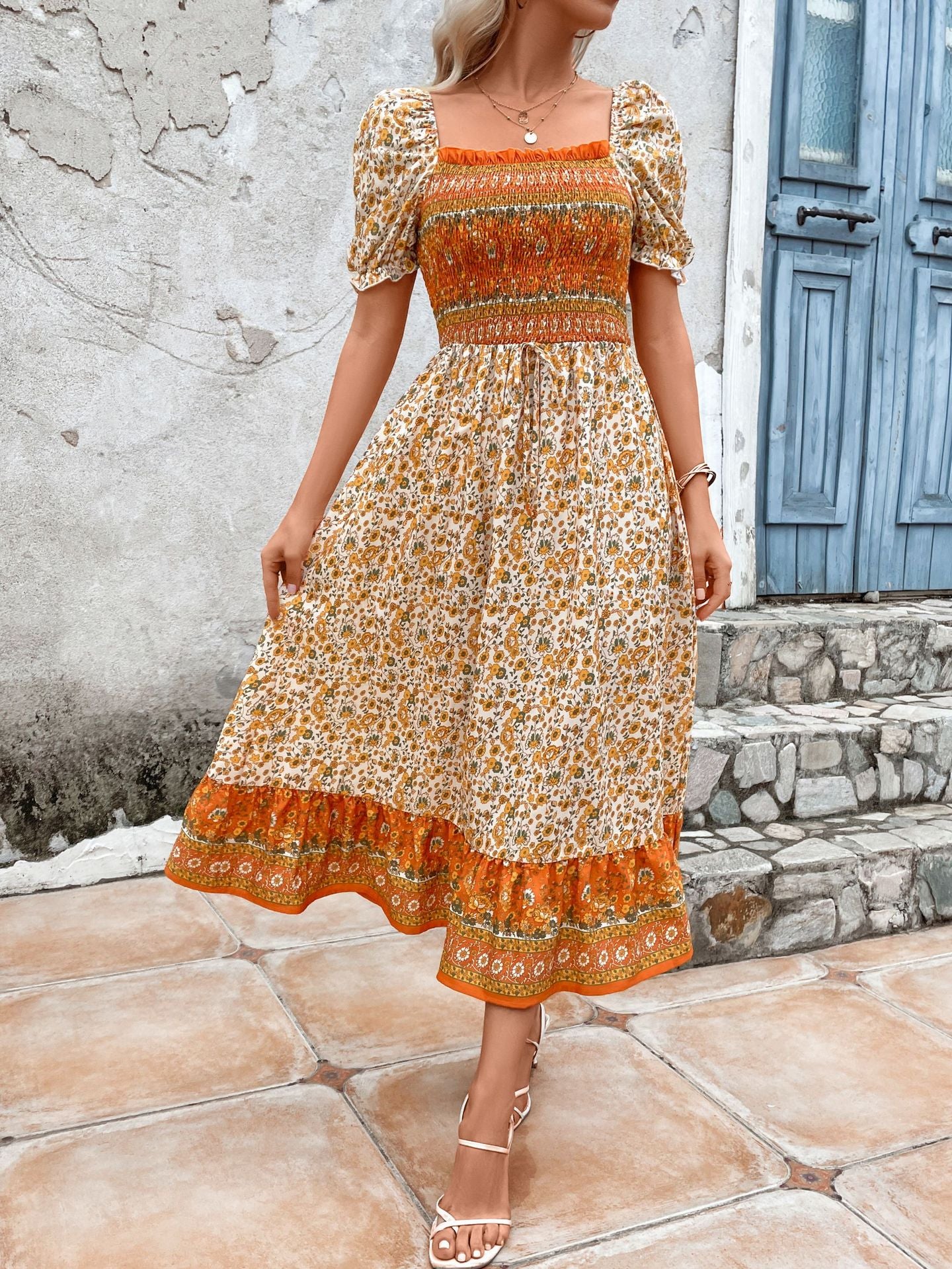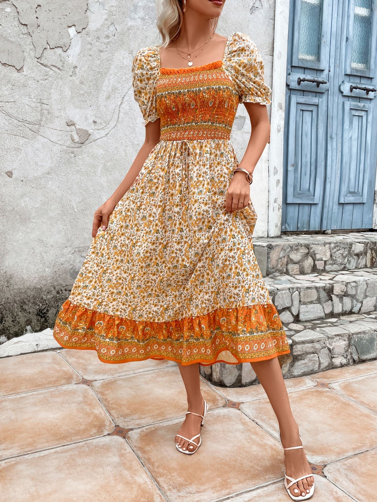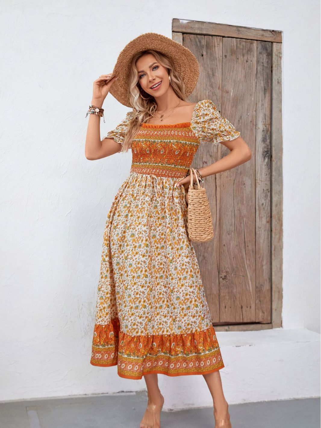 Bohemian Square Collar Puff Sleeve Printed Women's Dress