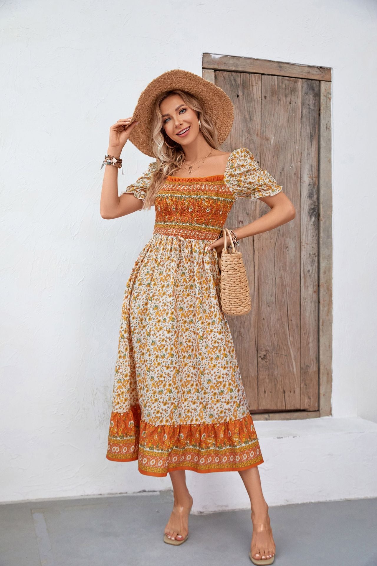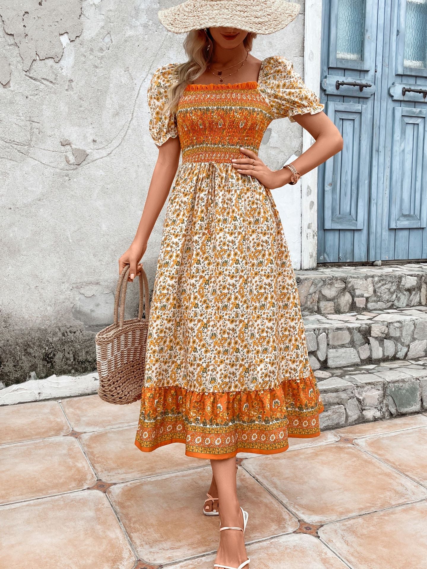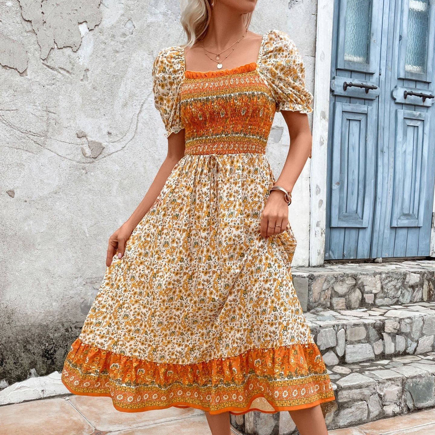 Bohemian Square Collar Puff Sleeve Printed Women's Dress