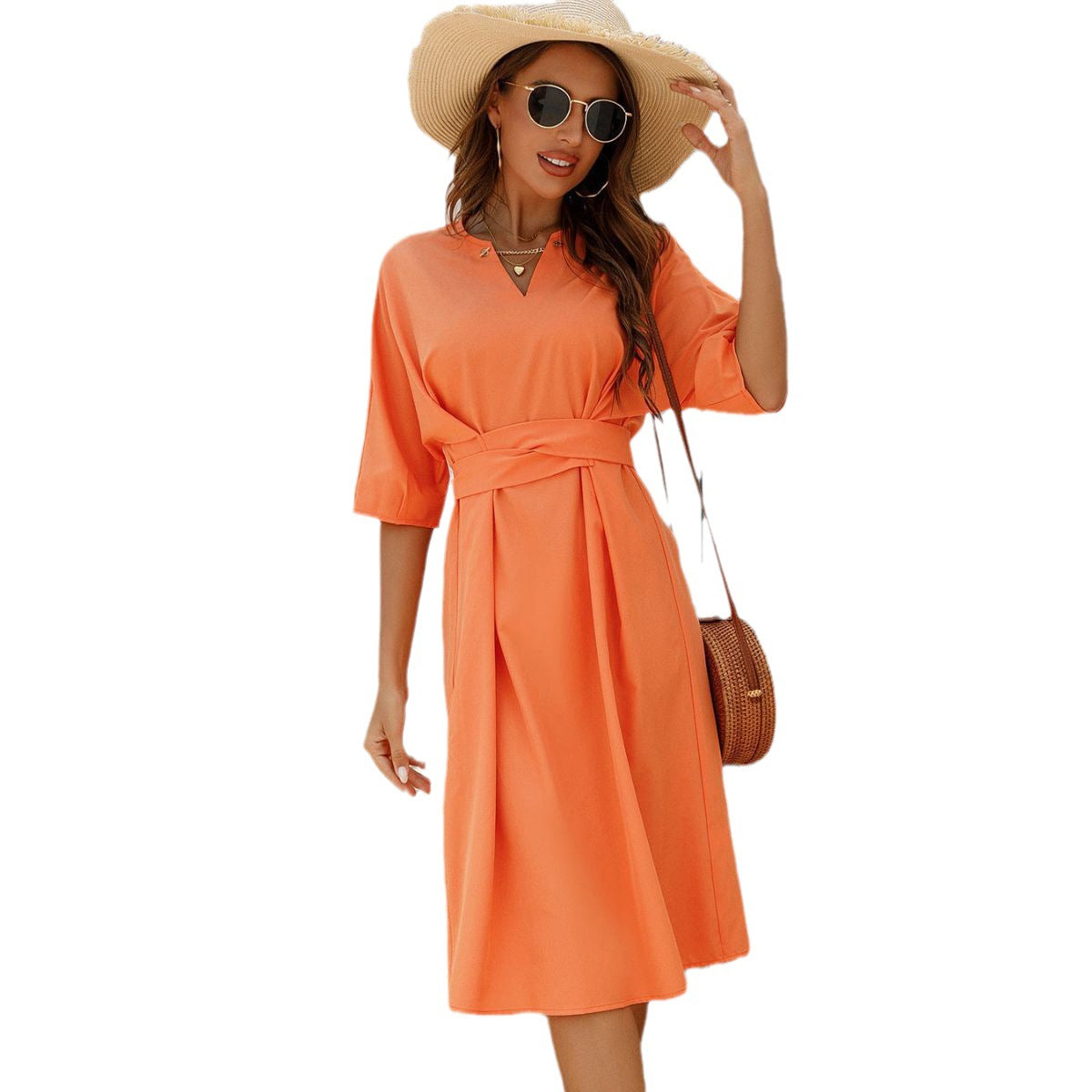 European And American Women's Clothing Amazon Short Sleeve Belt Zipper Solid Color French Dress New