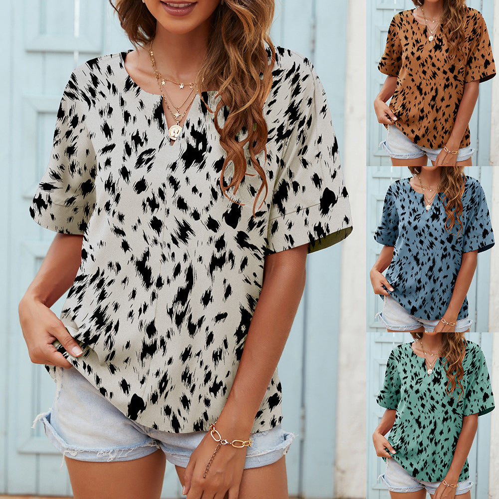 Printed V-neck Short-sleeved Casual Top T-shirt For Women