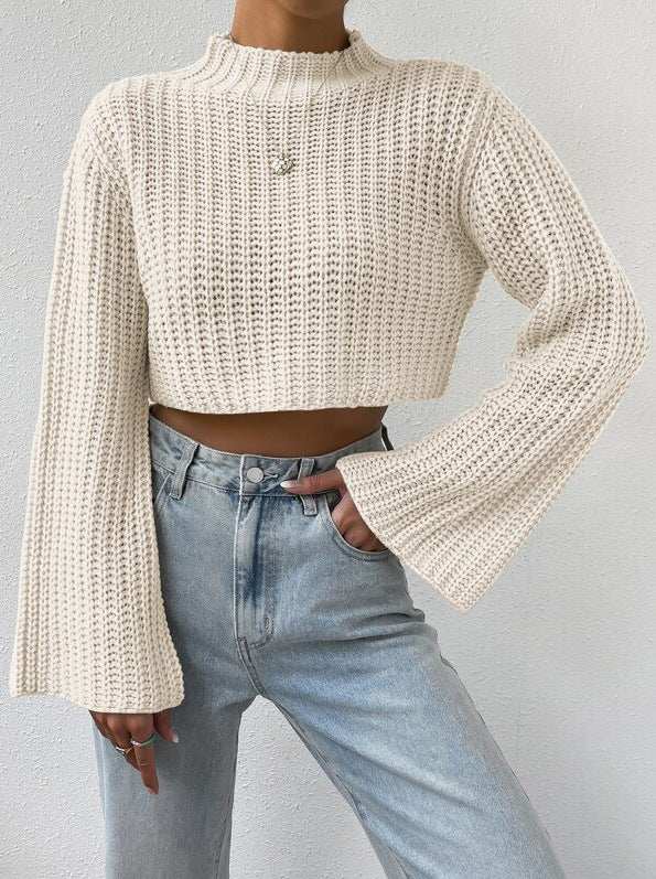 Pure Color All-matching High Waist Short Bell Sleeve Mock Neck Sweater Ladies