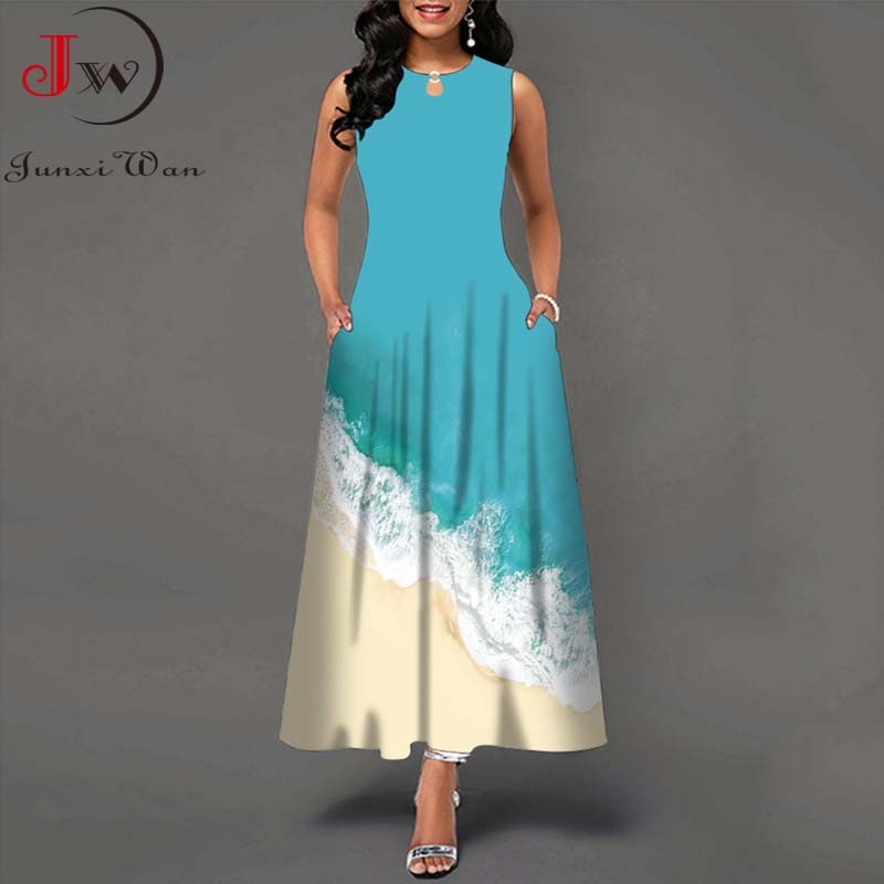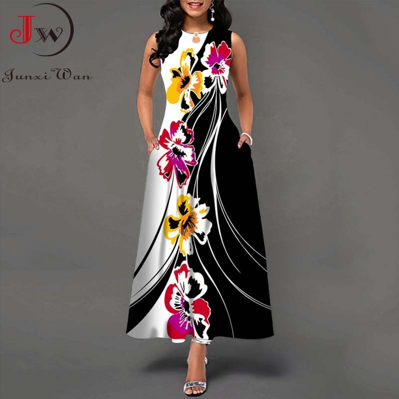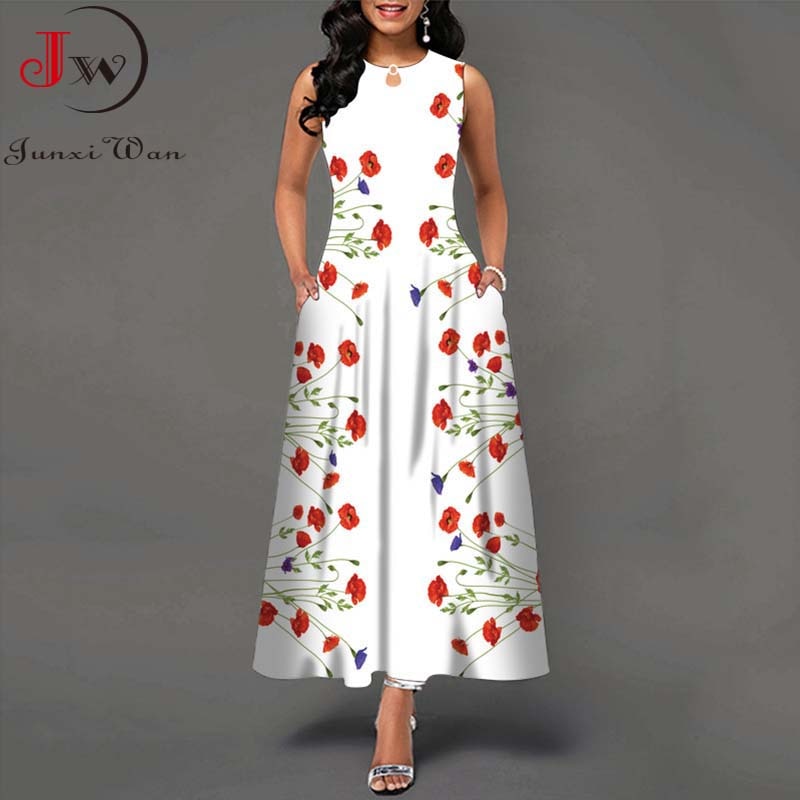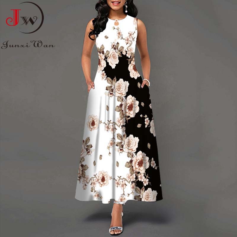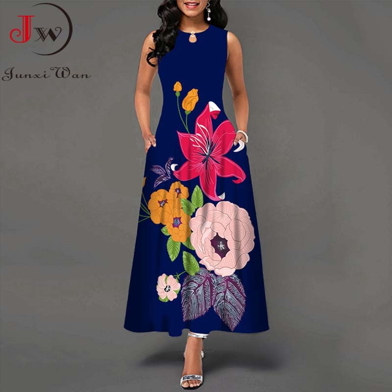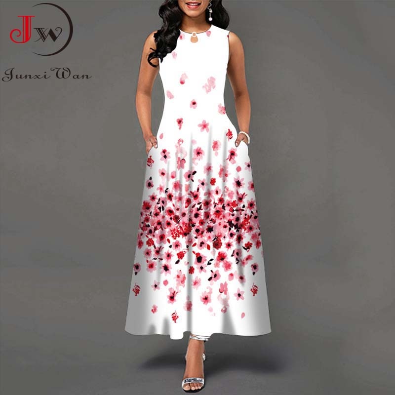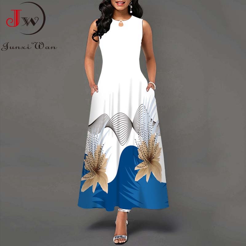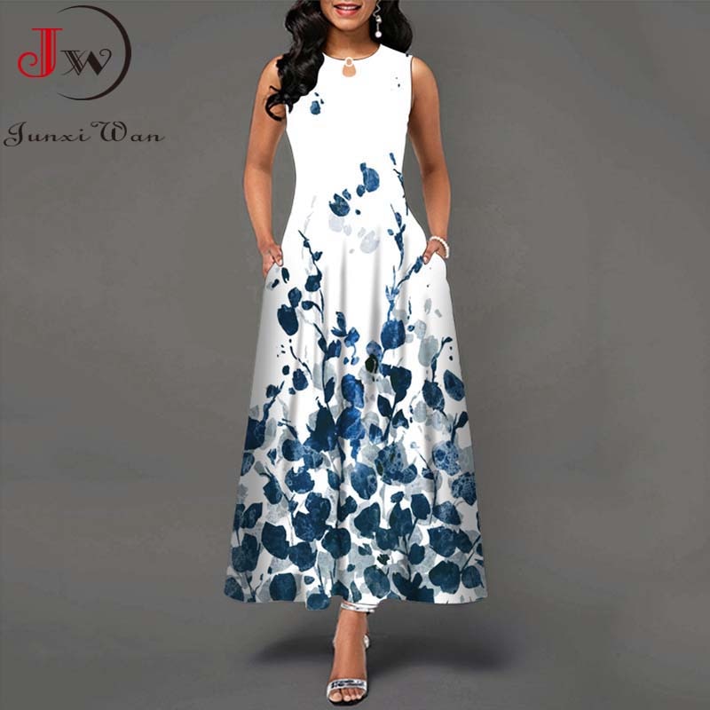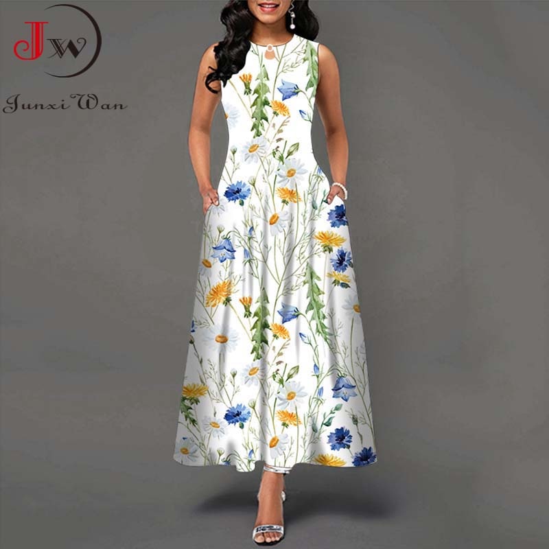 Summer Women Floral Printed Long Dresses Casual Sleeveless Beach Holiday Boho Maxi Dress Vestidos