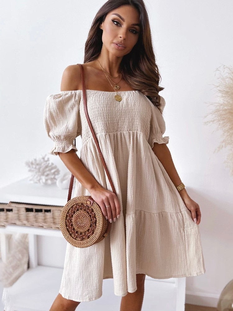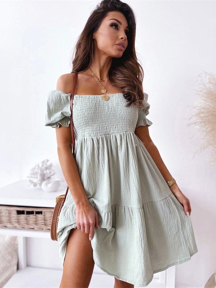 Women Sexy Backless Mini Dress 2023 Summer Fashion Lady Slash Neck White Puff Sleeve Big Swing Party Beach Dresses Casual Robe